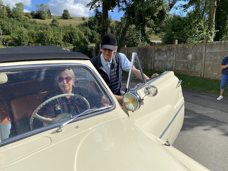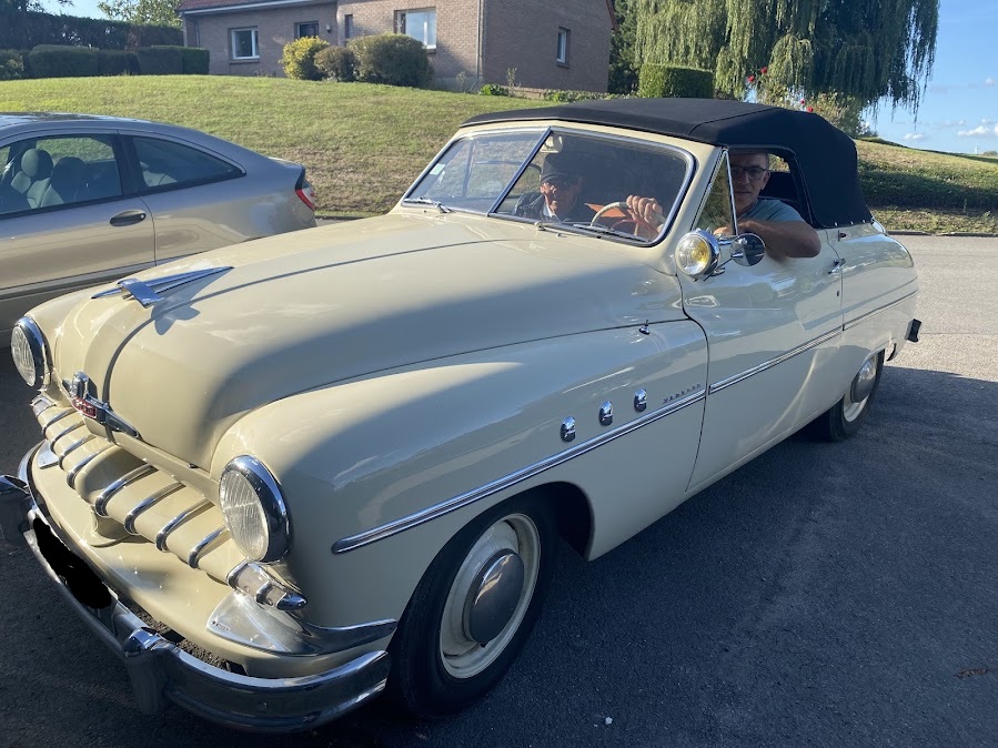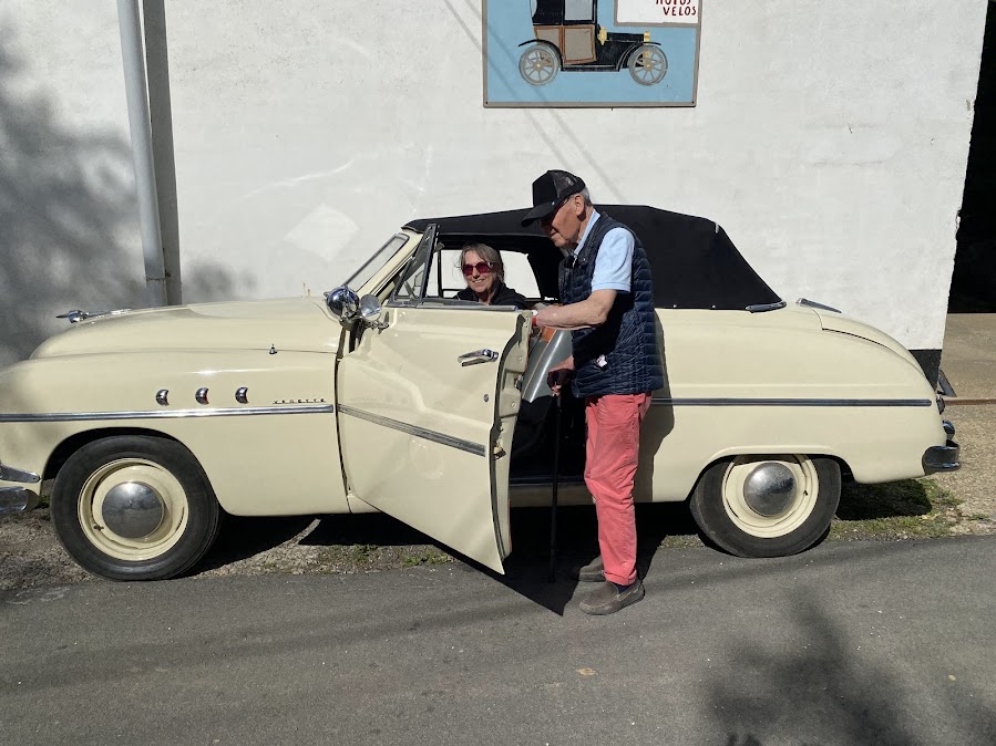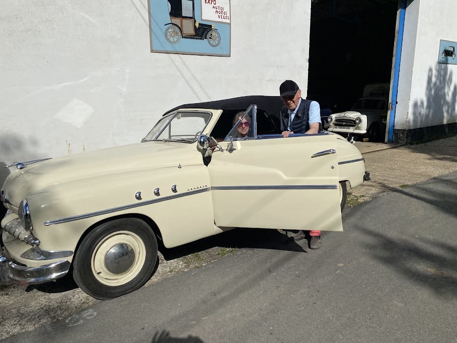 Le 5 Septembre, nous avons eu la visite d’un adhérent avec sa jolie Vedette cabriolet, ayant appartenu à Jean Gabin, et il a proposé à Didier et Marie de la conduire !